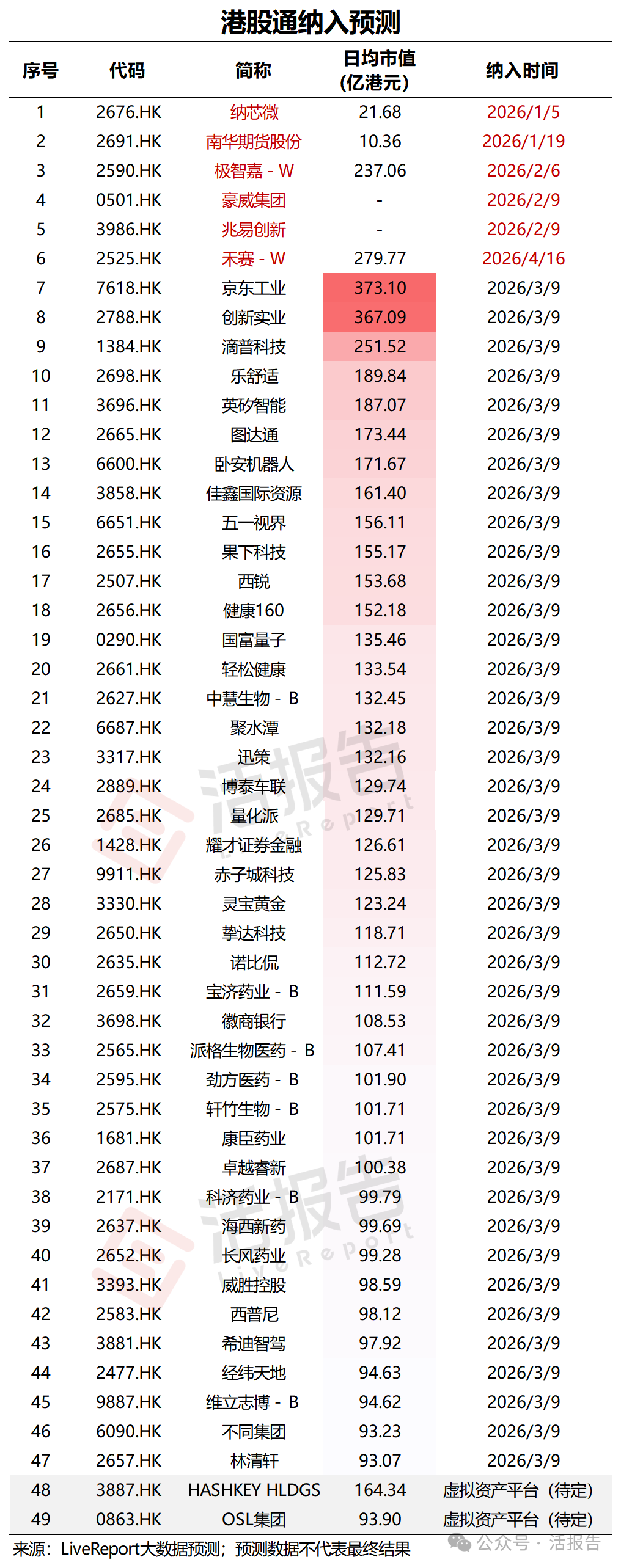 据LiveReport大数据预测,纳芯微将于2026年1月5日纳入港股通,南华期货股份将于2026年1月19日纳入港股通。