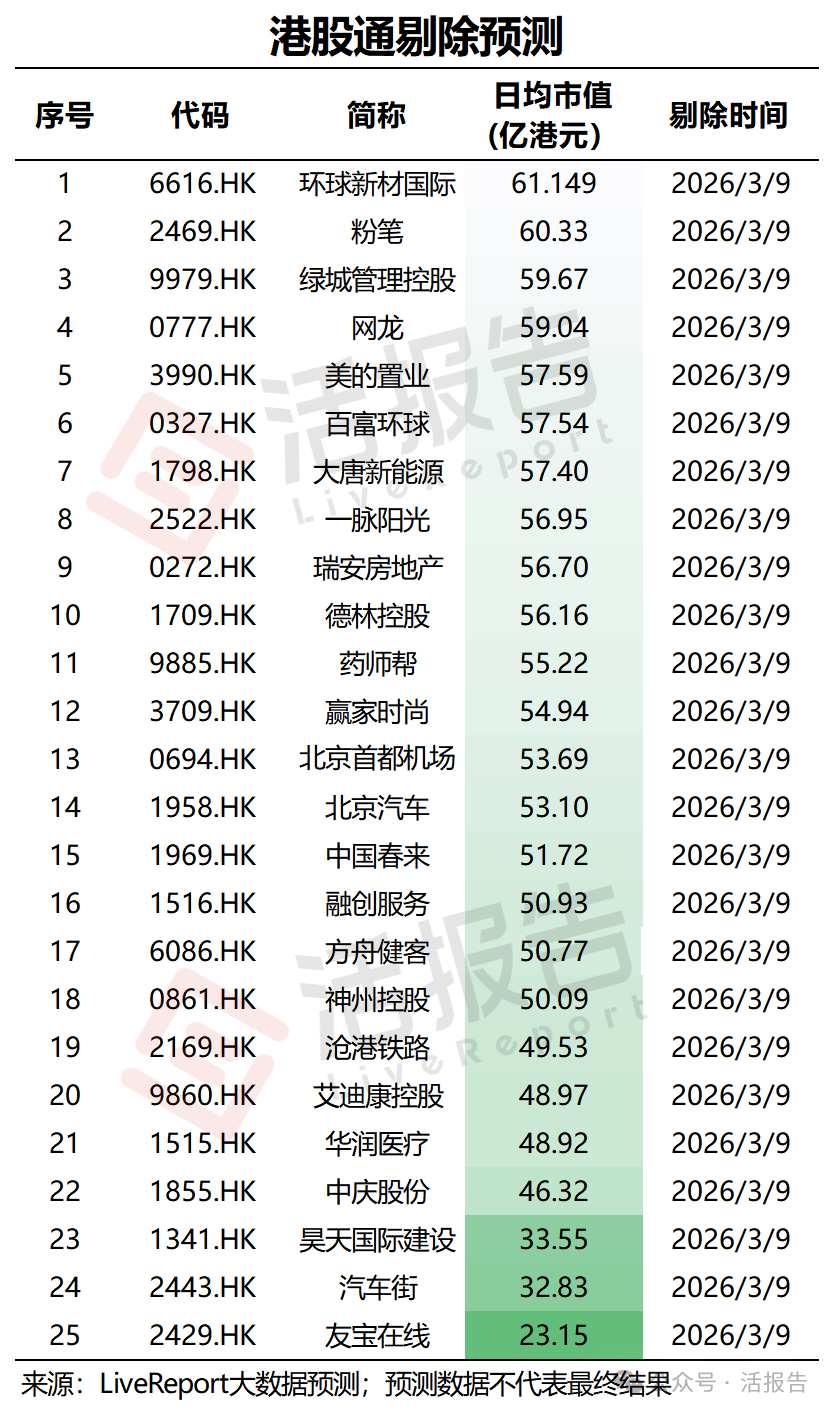 据LiveReport大数据预测,25只港股或于2026年3月9日的定期检讨中剔除港股通。若剔除港股通可投资名单,内地投资者只能单向卖出、不能买入相关股份。