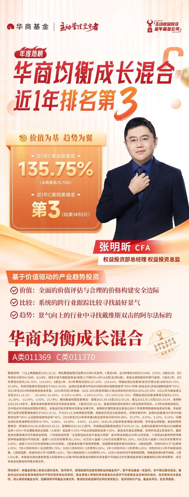 在这其中,由华商基金权益投资部总经理张明昕管理、华商基金旗下主动权益产品华商均衡成长混合基金业绩表现突出,数据显示,截至2025年12月31日,华商均衡成长混合C近1年业绩排名同类第三、近3年业绩排名同类第五,为投资者在带来了实实在在的投资获得感。