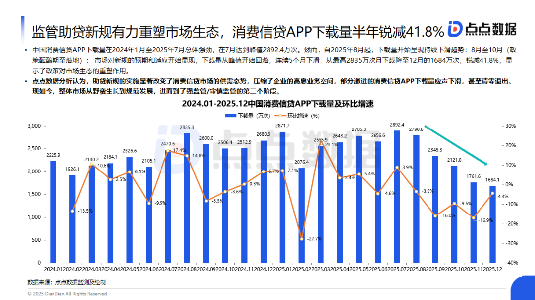 中国消费信贷APP下载量在2024年1月至2025年7月总体强劲,在7月达到峰值2892.4万次。然而,自2025年8月起,下载量开始呈现持续下滑趋势:8月至10月(政策酝酿期至落地): 市场对新规的预期和适应开始显现,下载量从峰值开始回落,连续5个月下滑,从最高2835万次月下载降至12月的1684万次,锐减41.8%,显示了政策对市场生态的重塑作用。