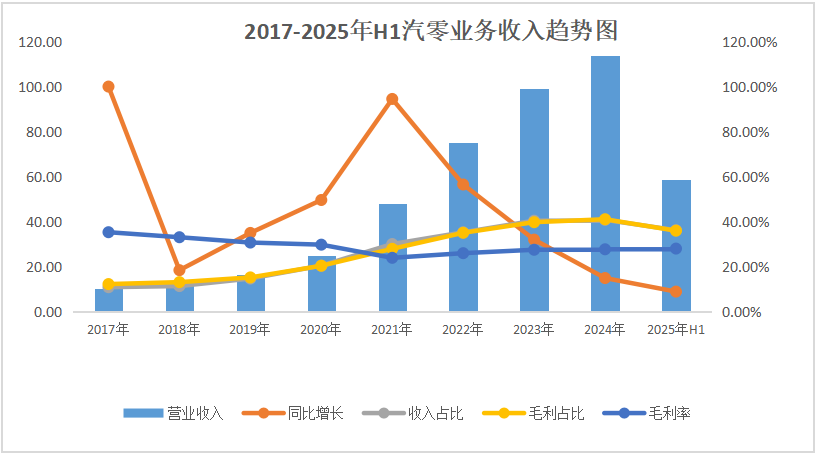 从2017年到2024年,公司汽零业务收入从10.34亿元增长10.01倍至113.87亿元,CAGR为40.88%,各年份均为增长。从目前的收入占比来看,汽零业务依然是公司的第二大业务,虽占比不及制冷业务,但它的平均增长速度较快。从毛利占比来看,它已显然成为成熟的第二增长曲线。和制冷业务相似,汽零业务毛利率也是多年保持在较为稳定的水平。2025年上半年,公司在汽零业务的表现也依然是向上增长。详见下表、图。