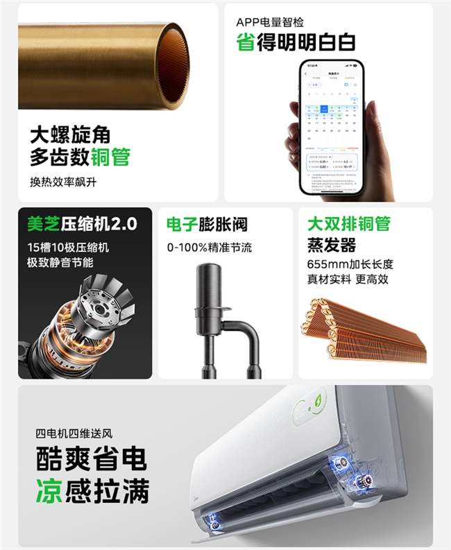核心动力方面,其配备行业首创的15槽10极变频转子式美芝压缩机2.0,这款核心部件支持6Hz低频稳定运行,可实现3520W制冷量与5420W制热量,同时兼顾静音与节能优势。为提升换热效率,产品搭载44mm加厚大双排铜管冷凝器及655mm加长铜管蒸发器,换热面积与效率显著提升,实现了快速制冷制热。