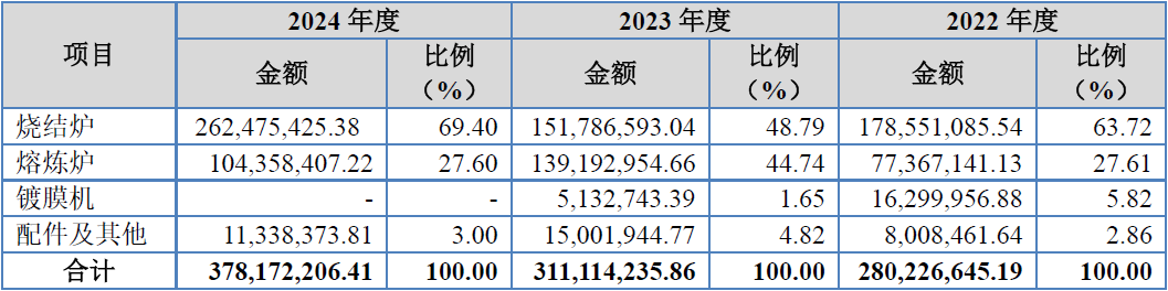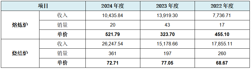从上表合计数可见,发行人主营业务收入分别为28,022.66万元、31,111.42万元和37,817.22万元,占营业收入的比重分别为99.89%、99.87%和99.83%,发行人主营业务突出。但实际上的上表显示,发行人核心的烧结炉业务依次实现收入17,855.11万元、15,178.66万元、26,247.54万元,经历先降后升变化。而上表中的熔炼炉业务显示,其分别实现收入7,736.71万元、13,919.30万元、10,435.84万元,经历先升后降的变化,与上述烧结炉业务收入变化趋势正好相反也正好互补。