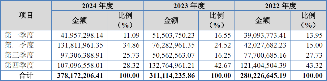 从上表可见,发行人第四季度收入占比分别为43.32%、42.67%、28.31%,2022年度-2023年度第四季度确认收入不但最高且明显高出其他三个季度较多,如果排除2024年度的第二季度因单个客户项目确认导致该季度收入实现比例最高外,2024年度似乎仍是第四季度收入实现占比最高。