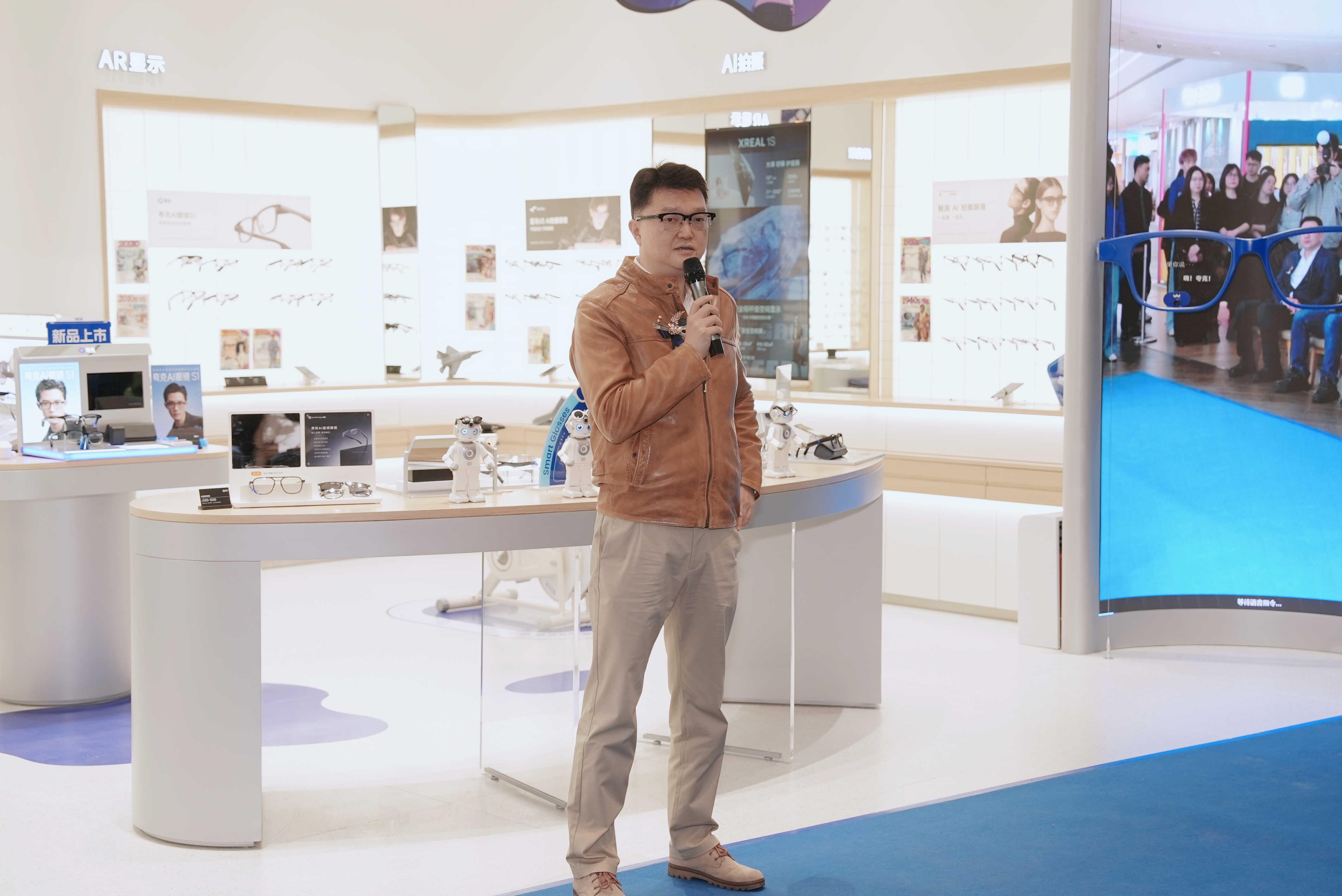 店内汇聚市面上一线的智能眼镜产品,覆盖音频、拍摄、光波导显示、观影四大功能类别,致力于构建起“品类最全、款式最丰”的产品矩阵。现场除陈列雷鸟、XREAL等设备外,还设置了多元化特色体验区,消费者可在模拟骑行中,体验夸克、魅族等品牌的AR导航;或在社交场景中,使用李未可、界环、影目等音频眼镜的开放音腔与实时翻译功能;还可以一站式感知暴龙AI智能眼镜语音拍照的实用价值。