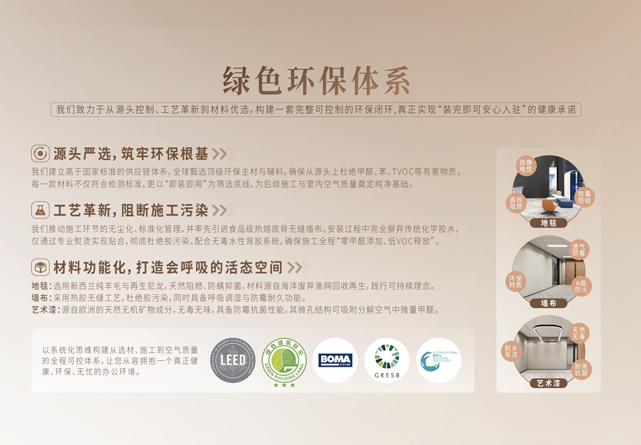 动工前,企业可通过VR技术预览办公场景,借助BIM模型提前解决90%以上潜在问题;施工环节采用模块化快装,效率较传统方式提升50%,同时严格遵循BOMA、LEED、WELL国际标准,选用环保材料与无尘无毒工艺,实现“即装即住、健康入驻”,最大化缩短企业入驻周期。