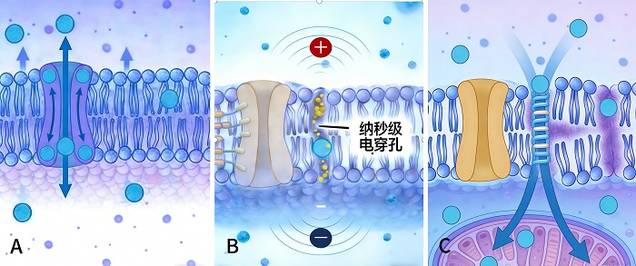 纳秒刀消融治疗原理。A.正常细胞膜:防止细胞外物质自由进入细胞的屏障,它保证了细胞内环境的相对稳定,使各种生化反应能够有序运行。B. 电穿孔作用:高压电脉冲作用于细胞,在细胞膜产生电穿孔。C. 细胞凋亡:细胞膜被破坏后,更多的离子以及有机分子进入细胞内或细胞液流出,导致细胞内稳态改变,从而致使细胞死亡。