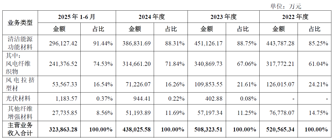 招股意向书显示,振石股份是一家从事清洁能源领域纤维增强材料研发、生产及销售的国家级高新技术企业。公司的主要产品可划分成风电纤维织物、风电拉挤型材、光伏材料以及其他纤维增强材料。根据中国玻璃纤维工业协会统计,公司2024年风电玻纤织物全球市场份额超35%,位列全球第一。