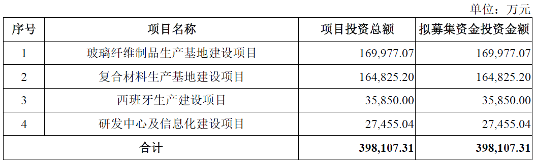 振石股份本次IPO募集资金拟重点投向四大项目,具体包括“玻璃纤维制品生产基地建设项目”、“复合材料生产基地建设项目”、“西班牙生产建设项目”以及“研发中心及信息化建设项目”。其中,“玻璃纤维制品生产基地建设项目”和“复合材料生产基地建设项目”拟投入资金分别为169,977.07万元、164,825.20万元,二者合计出资额占比超过八成。