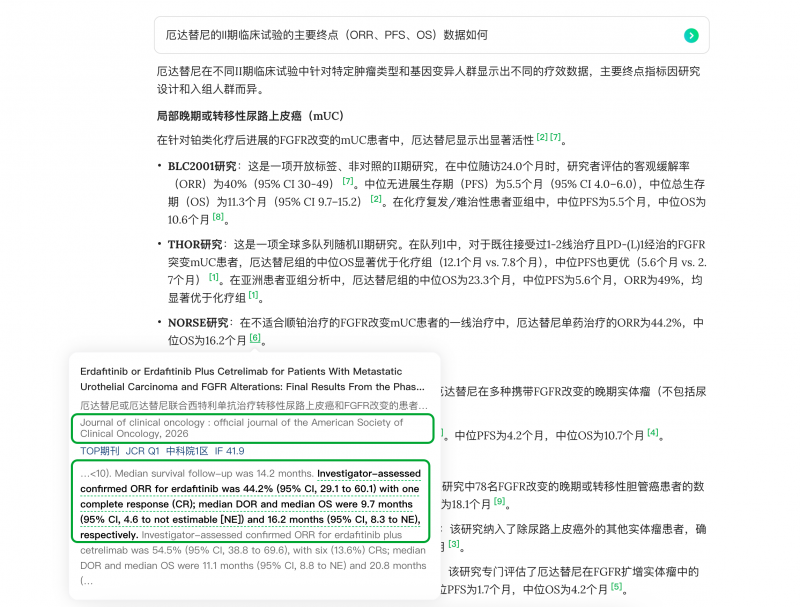 例如,当用户在氢离子搜索“厄达替尼的II期临床试验的主要终点(ORR、PFS、OS)数据如何”时,系统不仅给出结构化的医学结论与分析,还会在每项结论旁标注引用标签,点击标签即可查看该结论引用的原始文献及支撑的具体语句。用户可以从结论到证据的无缝追溯,确保每一处引用均可验、可信。