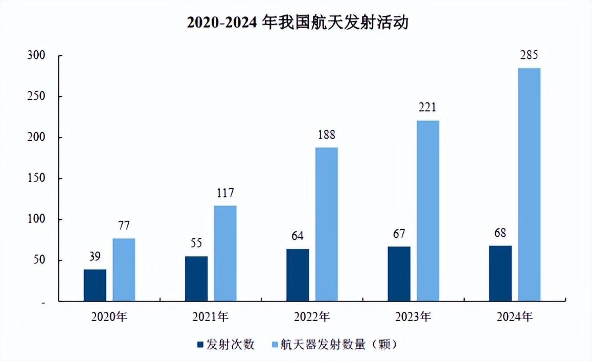 2020年以来,全球航天持续呈现高度活跃发展态势。尤其是以中美为代表的大国,纷纷将航天视作国家整体实力的重要组成部分,航天战略性作用日益突出。全球航天发射活动强劲增长,各领域取得一系列突破,进入空间、探索空间、利用空间能力不断提升。2024年,全球共实施263次发射任务,同比增长18%,发射航天器2873个,刷新历史纪录,发射航天器总质量2171吨,为本世纪以来最高值。从国内情况来看,2024年中国航天发射活动呈现出蓬勃发展的新态势,全年航天发射次数达到68次,创历史新高并稳居全球第二。