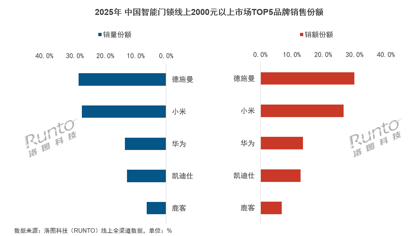 奥维云网在报告中指出,2025年,中国智能门锁行业在技术门槛提升、用户品牌认知增强等因素驱动下,市场资源加速向优势企业聚集,中长尾品牌生存空间收窄。在传统电商渠道,TOP5品牌零售量占比接近60%,TOP10品牌合计份额超过75%,头部效应愈发显著。其中,德施曼位居线上市场(含传统电商与内容电商)零售额榜首,在线上2000元及以上价格段市场中实现量额双第一,领跑高端市场。