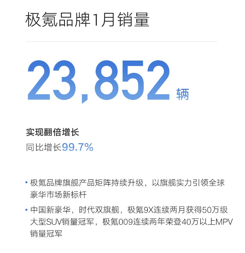 2025年,领克与极氪销量增幅分别为22.8%和0.9%,极氪也成为吉利汽车旗下中唯一没有完成销量目标的品牌。这一情况在2026年有望好转,1月,极氪品牌2.4万辆,伴随9X热销,林杰正在带领团队完成“极氪向上”的使命。