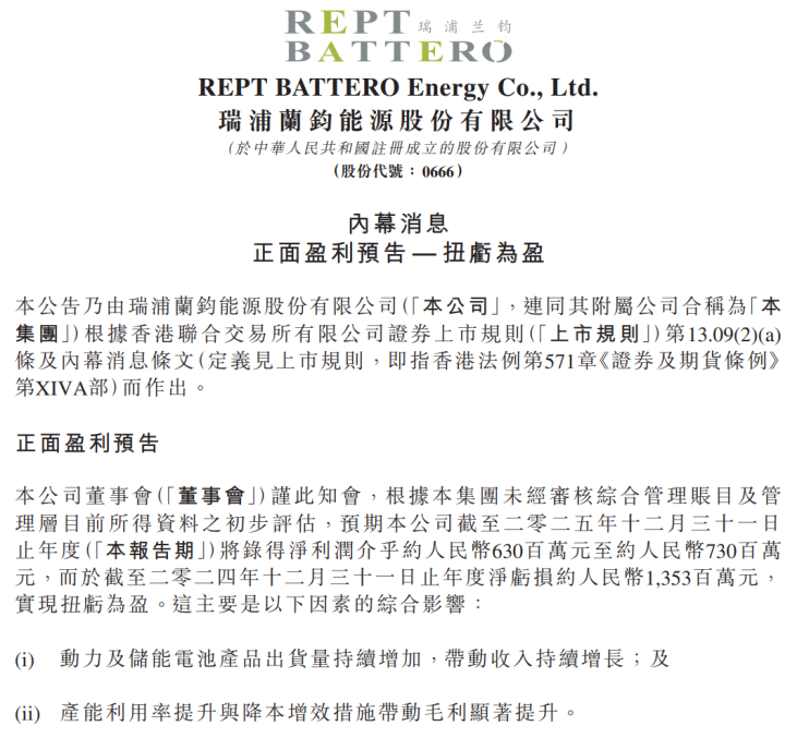 2月2日早上港股开盘前,瑞浦兰钧(00666.HK)发布关于扭亏为盈的正面盈利预告,公司表示,由于动力电池和储能电池产能利用率提升、出货量持续增加,进而带动营业收入持续增长,因此预期2025年全年实现净利润6.3亿元~7.3亿元,同比2024年13.53亿元的净利润亏损,实现扭亏为盈,同时也是自2019年以来首次实现盈利。