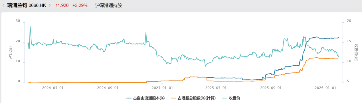 根据Wind统计,港股通投资者从2025年8月份开始大举买入瑞浦兰钧,港股通持股总数,从2025年8月份的约800万股,连续上升到2025年12月份的超过1.15亿股,并维持至今,对应港股通持股占流通股本的比例,也由1.6%附近上升到当前的22%以上。