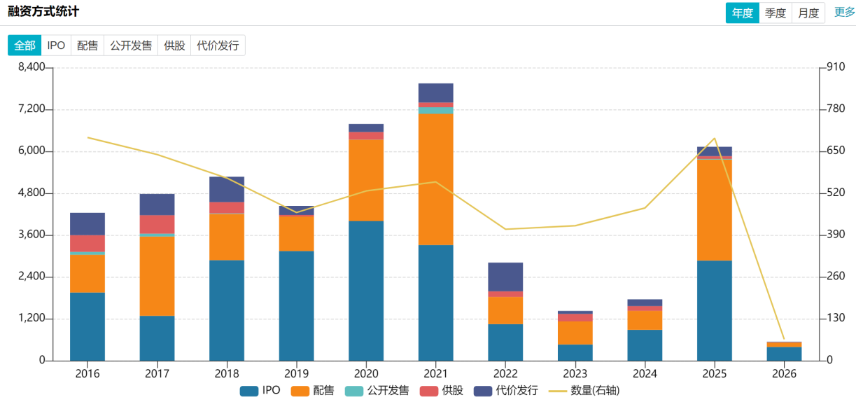 一方面,港股流动性匮乏,或许与一级市场狂欢后对二级市场的抽血效应有关。根据Wind数据显示,2025年全年共有117家公司在港上市,较2024年增长67.14%,全年港股IPO募资额达2856.93亿港元,较2024年大幅增长224%,募资规模成功重返全球榜首。