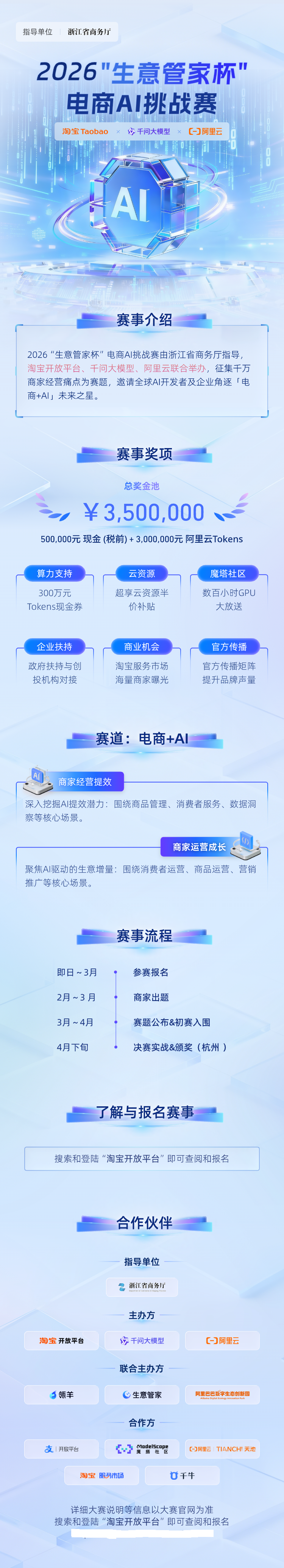 2月 8 日,由浙江省商务厅指导,淘宝开放平台、千问大模型、阿里云、瓴羊联合举办的2026“生意管家杯”电商AI挑战赛正式开放报名通道(登陆“淘宝开放平台”即可查阅和报名)。