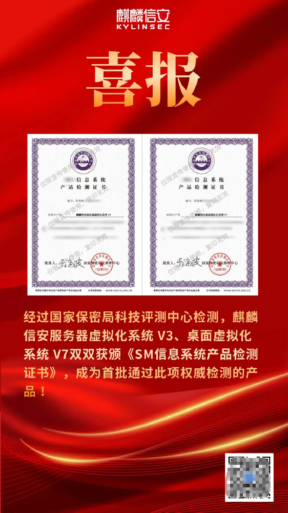 麒麟信安服务器虚拟化系统 V3、桌面虚拟化系统 V7成功通过了国家保密科技检测中心(简称:国保测)检测,并获颁《SM信息系统产品检测证书》!成为首批通过此项权威认证的产品。