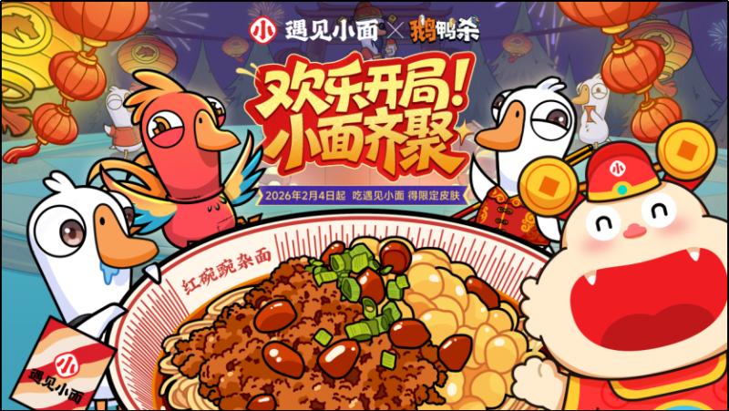2026年2月年味渐浓之时,中式餐饮连锁头部品牌遇见小面与爆火手游《鹅鸭杀》的联名活动正式上线。活动上线首日便引爆Z世代消费市场,收获年轻消费群体的关注与追捧。