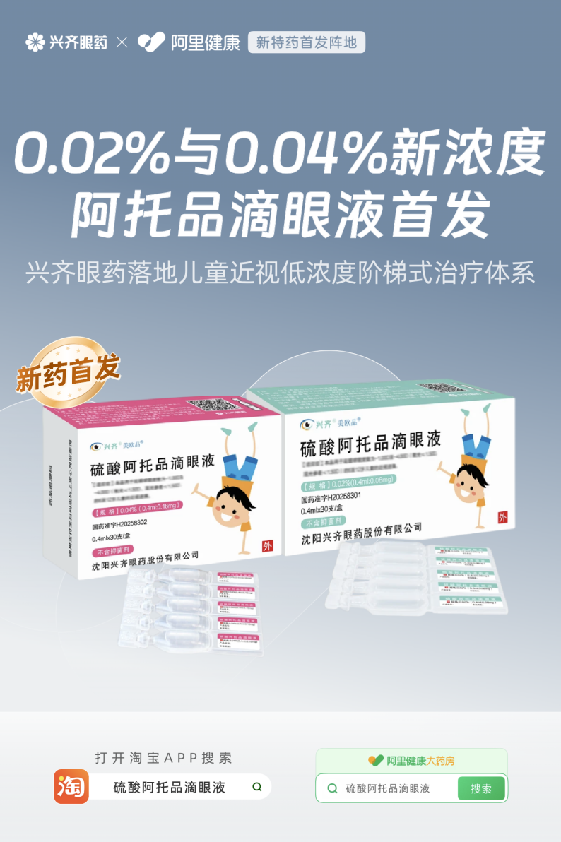 2月24日,沈阳兴齐眼药自主研发的0.02%与0.04%浓度硫酸阿托品滴眼液正式在阿里健康首发。该产品适用于6至12岁、球镜度数为-1.00D至-4.00D(散光≤1.50D、屈光参差≤1.50D)的儿童,用于延缓近视进展。至此,兴齐眼药已形成0.01%、0.02%和0.04%三档浓度梯度,构建起国内首个用于儿童近视管理的低浓度阿托品阶梯式治疗体系,标志着我国儿童青少年近视药物干预迈入“因人施治、精准防控”的新阶段。