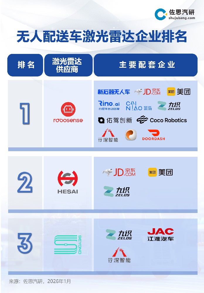 2026年2月24日,佐思产研发布最新行业数据:高潜力的无人配送车细分市场,速腾聚创的激光雷达搭载量已稳居行业第一。新石器、九识、白犀牛、京东、美团、菜鸟,乃至海外的Coco Robotics、Doordash,这些占据市场超90%份额的头部玩家,均选择了速腾聚创作为核心供应商。当国家邮政局在今年1月明确将出台加快推广应用无人配送技术政策文件时,意味着速腾聚创在无人配送机器人领域的领先地位将兑换成2026年的业绩爆点。
