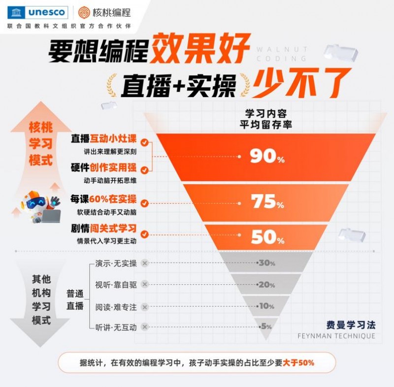 ●高频实操提升编程能力:核桃编程首创“直播互动+实操教学体系”,真人教师直播教学带着学生实操练习,提出“一学九练”模式。据核桃编程2026年课程报告,其每堂课平均提供9-12次动手实操机会,有效实操时间占比达到约60%。相比市面上其他产品仅10%-20%的实操时间,这种“以练代讲”的设计极大提升了学习效率。通过高频的实践反馈,学员在短周期内能力增长显著,学习体验也更为高效。
