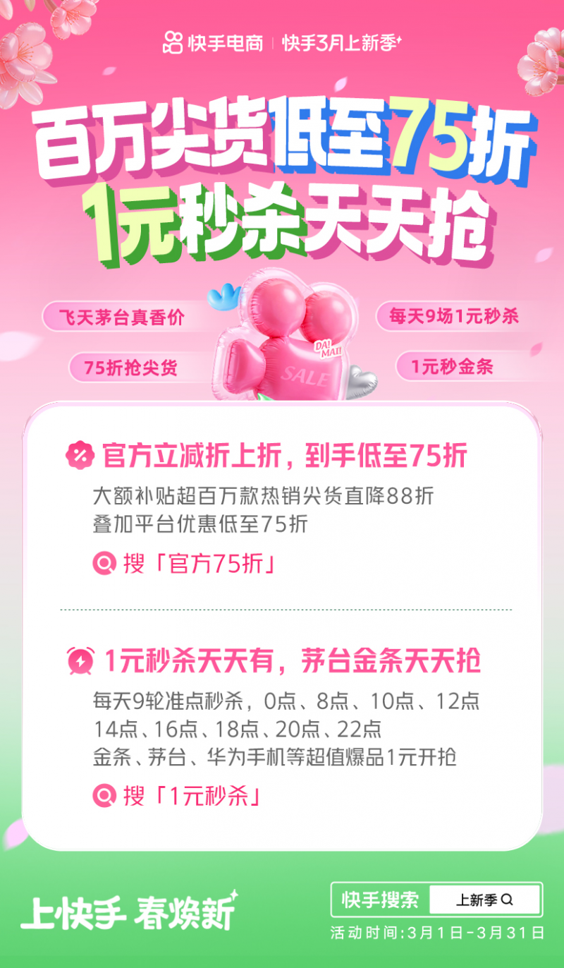 (原标题:尖货官方立减低至75折+1元秒杀 快手正式开启3月上新季)