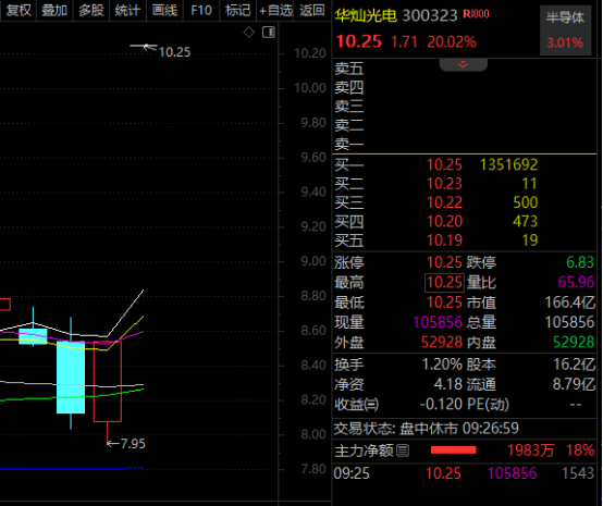 华灿光电表现更加强势,该股开盘即“20cm”涨停,集合竞价后封单一度超过135万手。截至上午收盘,该股封单仍高达74万手。另外,聚飞光电、联建光电、雷曼光电等个股封单也较高,均超30万手。