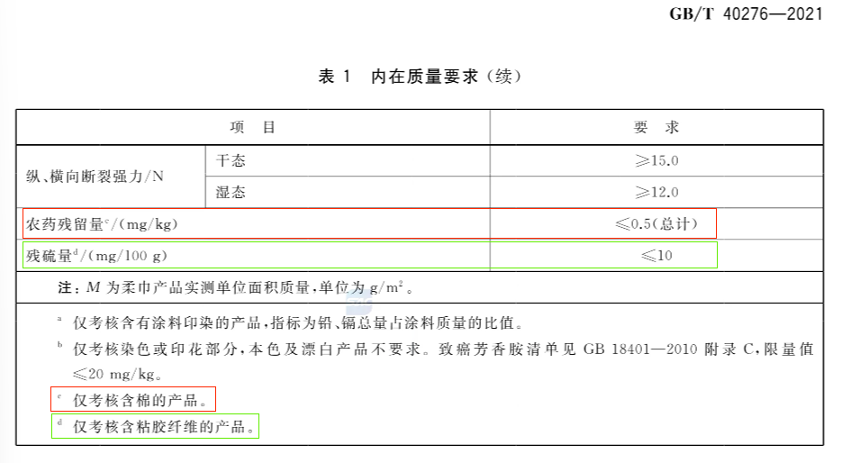 针对上述这两类洗脸巾,国家标准GB/T 40276—2021《柔巾》也制定了相应的质量安全指标:对于纯棉洗脸巾,要求检测其农残(农药残留量),因为棉花种植过程中可能会使用杀虫剂、除草剂等农药;对于粘纤洗脸巾,要求检测其残硫量,因为粘胶纤维的生产过程中需要使用到含硫物质,如果加工不到位,就可能会存在硫化物过量残留的问题。