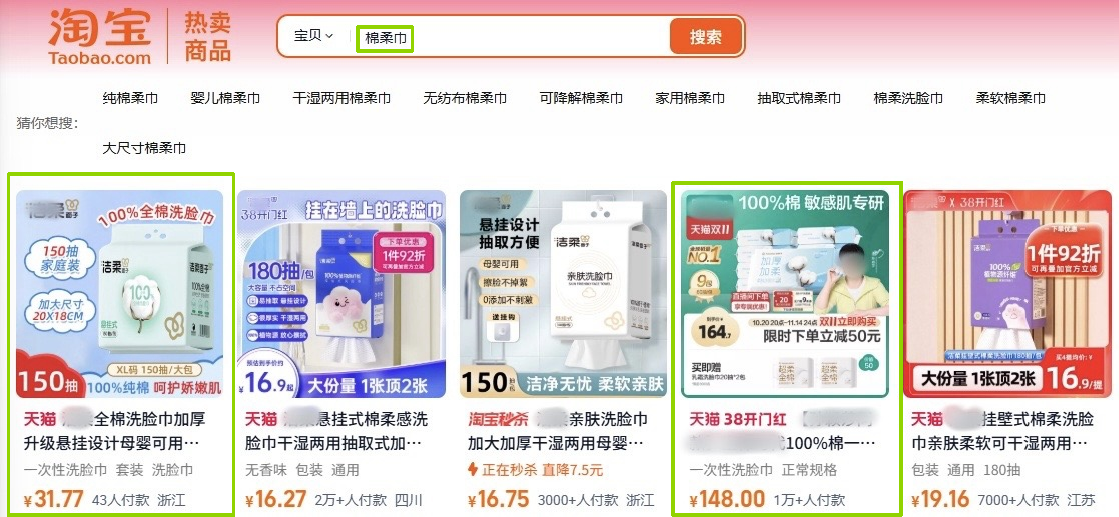 ▲搜索“棉柔巾”,只有绿框产品为“100%棉”