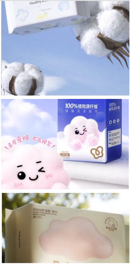 不少商家会在宣传里标注“棉柔巾”或“绵柔巾”,还会提到“亲肤”“柔软”“100%棉”“100%植物源纤维”等词,包装设计还会以蓬松的棉花、云朵、植物等作为元素,给消费者打造一种纯天然的产品印象。