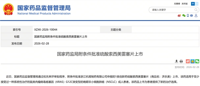 2月28日,国家药品监督管理局发布公告,上海济煜医药科技股份有限公司自主研发的 1 类抗肿瘤创新药济乐美@(硫酸索西美雷塞片)获批上市,主要用于治疗至少接受过一种系统性治疗的鼠类肉瘤病毒癌基因KRAS G12C突变型的晚期非小细胞肺癌(NSCLC)成人患者,为晚期非小细胞肺癌患者带来治疗新选择。