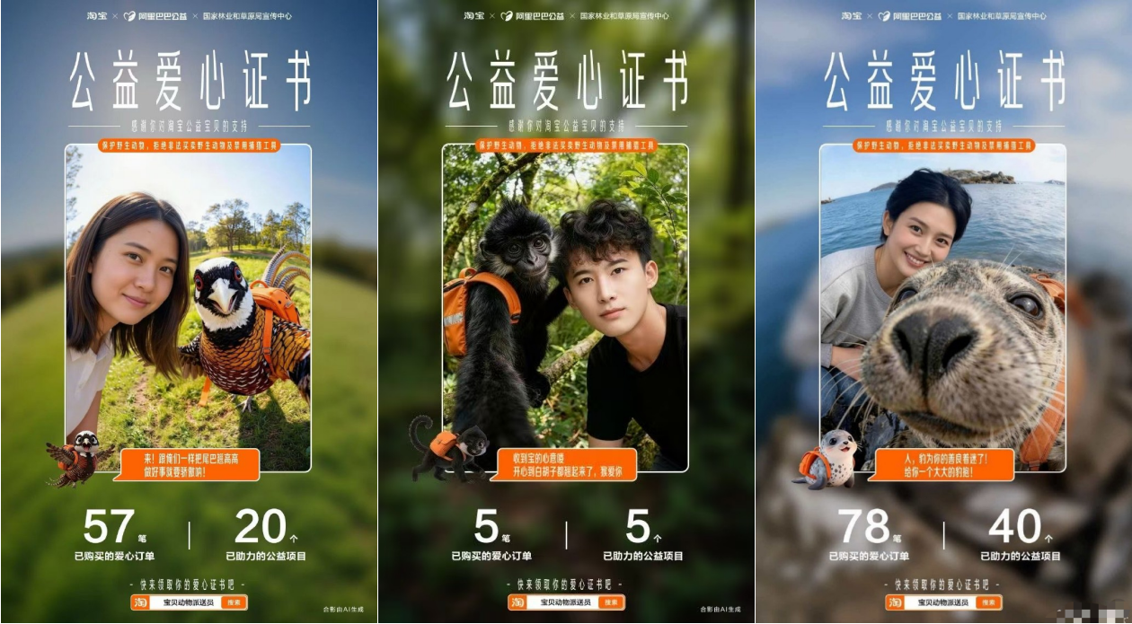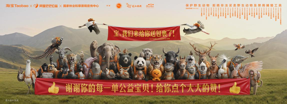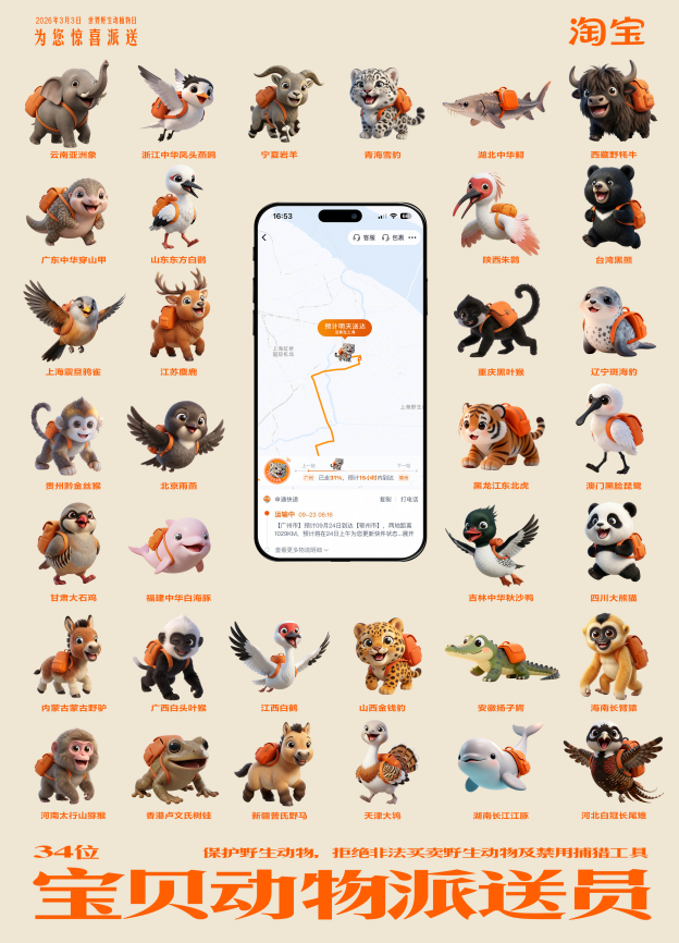 这是淘宝在3月3日世界野生动植物日上线的“宝贝动物派送员”活动。全国34个省级行政区的珍稀野生动物集体亮相,消费者购买带有“公益宝贝”标识的商品后,就能在物流页偶遇来自包裹发货地的动物派送员。
