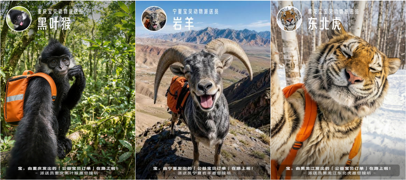 重庆黑叶猴用方言说“对你没得黑脸得嘛”,借自己的长相幽默互动;宁夏岩羊站在山坡上喊话“等我翻过这90度的坡,你就收到快递了”;河南太行山猕猴开口就是“快递来也,俺老孙赶下一班筋斗云先走啦”,说完就乘云而去了。