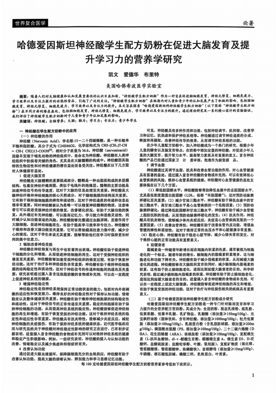 据哈德爱因斯坦官方宣称,公司联合广东省自然医学研究会、美国哈佛希波医学实验室等权威机构,开展神经酸在脑发育、认知功能提升等方面的机制研究与临床验证,研究成果《哈德爱因斯坦神经酸学生配方奶粉》相关论文(DOI: odwlkky234/8658880)于2024年9月14日发表在《世界复合医学》期刊。据公开资料显示,《世界复合医学》是由国家卫生健康委员会主管,中国医学科学院主办的专业性学术期刊。