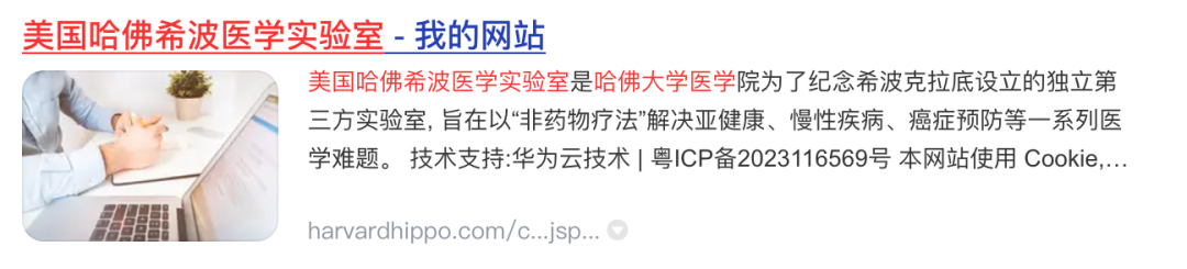 值得一提的是,《消费者报道》记者尝试登录美国哈佛希波医学实验室官方网站(域名:harvardhippo.com)发现,该网站无法正常访问。而搜索页面显示的“实验室介绍”称,其是哈佛大学医学院为了纪念希波克拉底设立的独立第三方实验室, 旨在以“非药物疗法”解决亚健康、慢性疾病、癌症预防等一系列医学难题。