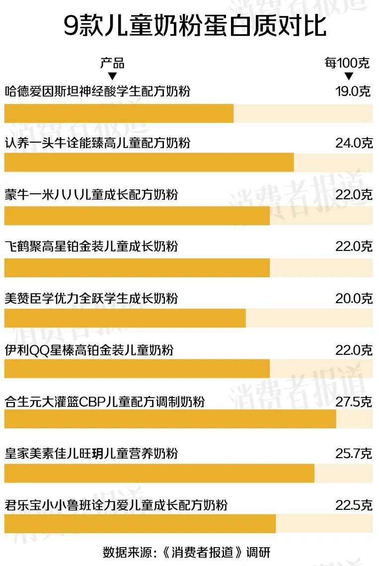 《消费者报道》记者随机对比9款相同执行标准的儿童奶粉后发现,哈德爱因斯坦这款奶粉的蛋白质含量,低于另外8款同类产品,在核心营养指标上并不具备其宣传中的优势。