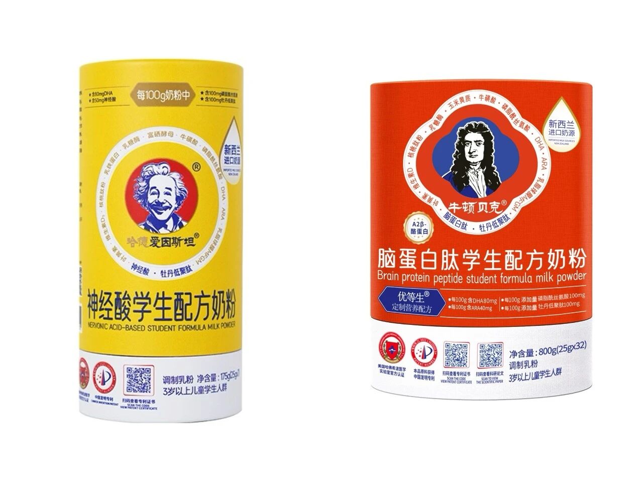 除产地误导外,攀附名人也是常见的误导手段。例如,儿童奶粉市场里,一些品牌直接将“爱因斯坦”“牛顿”作为产品名称的一部分,甚至注册为商标,如“哈德爱因斯坦神经酸学生配方奶粉”“牛顿贝克脑蛋白肽学生配方奶粉”“哈勒姆小小牛顿儿童成长奶粉”等。