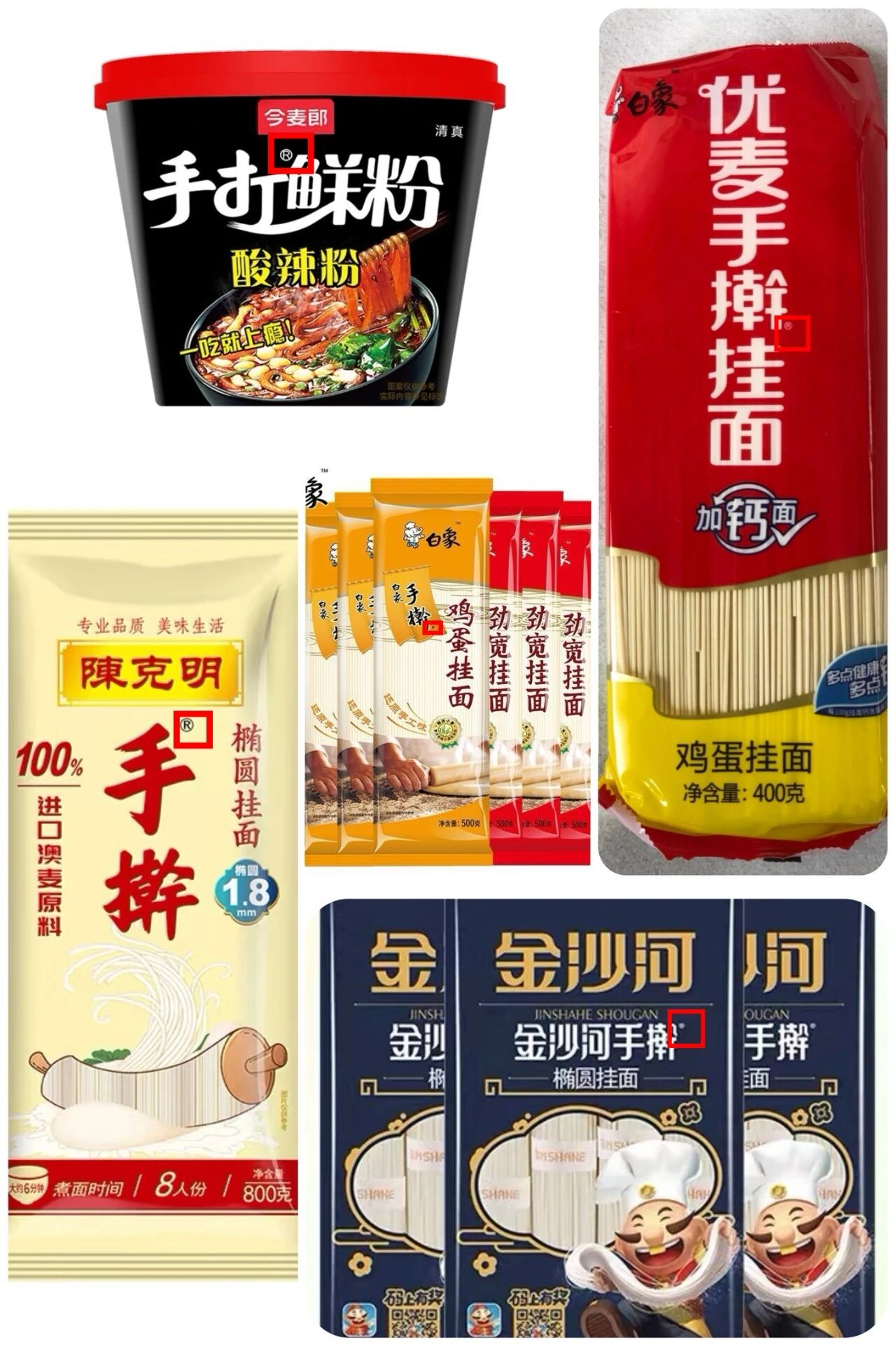 然而,今麦郎食品股份有限公司的“手打鲜粉”、湖南裕湘食品有限公司的“裕湘手擀”、河北金沙河面业集团有限责任公司的“金沙河手擀”、山东华麟面业有限公司的“华麟手擀”、河南优麦食品有限公司的“优麦手擀”、陈克明食品股份有限公司的“陈克明 手擀”、白象食品股份有限公司的“白象手擀”等产品里的“手打”“手擀”,都是注册商标。