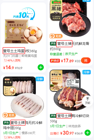 而在另一家生鲜APP上,生鲜猪肉类产品仍保留“壹号土猪”;鸡肉、鸭肉产品则标注为“壹号土牌”;一款鸡蛋产品的全称为“壹号土土鸡蛋”,既有注册商标标识,又将“土”字保留在商品描述中。