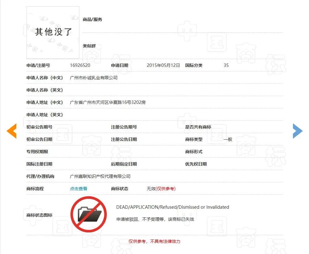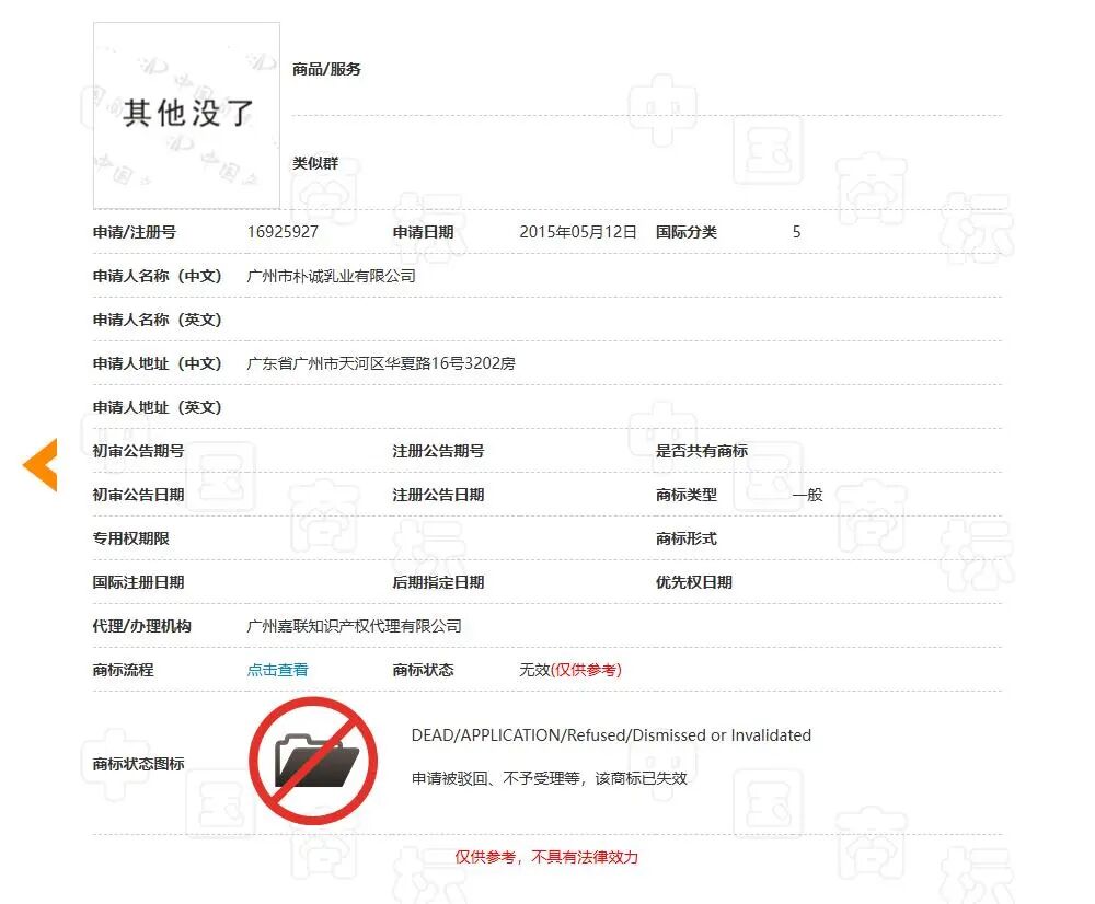 《消费者报道》查询中国商标网发现,广州市朴诚乳业有限公司此前申请的多个“其他没了”商标,目前均处于“无效”状态。
