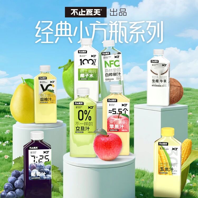 “山里采的”葡萄汁、“树上摘的”椰子水、“森林里的”白桦树汁、“地里掰的”玉米汁、“果园里的”苹果汁,这些充满自然气息的产品名称,让人仿佛看到果农清晨采摘、山泉清澈流淌的画面。