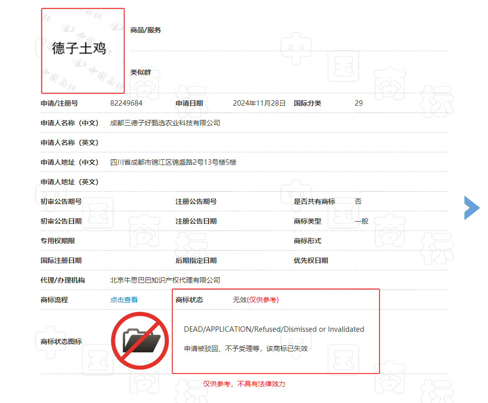此外,《消费者报道》记者通过中国商标网查询发现,成都三德子好甄选农业科技有限公司申请注册的“德子土”商标专用权期限至2034年01月20日,而“德子土鸡”“德子土鸭”“德子土猪”商标均处于“无效”状态。
