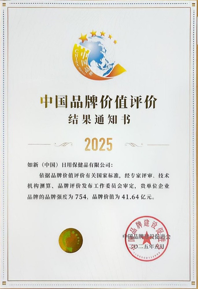 中国品牌建设促进会发布的如新(中国)2025年“中国品牌价值评价”证书