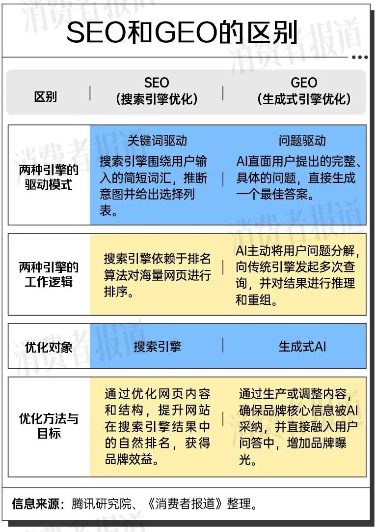 与搜索引擎优化服务SEO(Search EngineOptimization)不同,GEO(Generative Engine Optimization)的中文全称为“生成式引擎优化”,它是一项面向AI搜索的内容营销服务,通过生产或调整品牌内容、产品信息,让AI快速提取关键信息,并在用户与AI的问答交互中优先引用品牌内容,本意是为品牌方增加曝光量,实现引流。