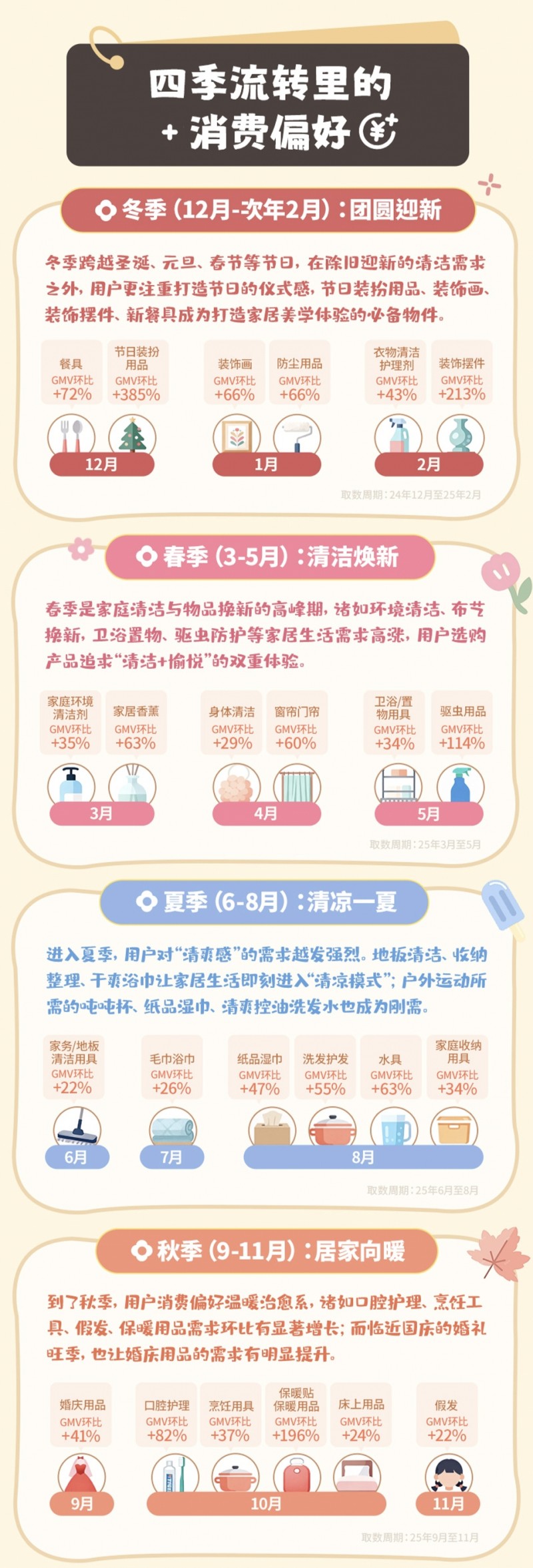 伴随一年四季的更迭,老铁们的消费选择与自然节律紧密相连,每一次季节转换都催生着新的品类增长点。
