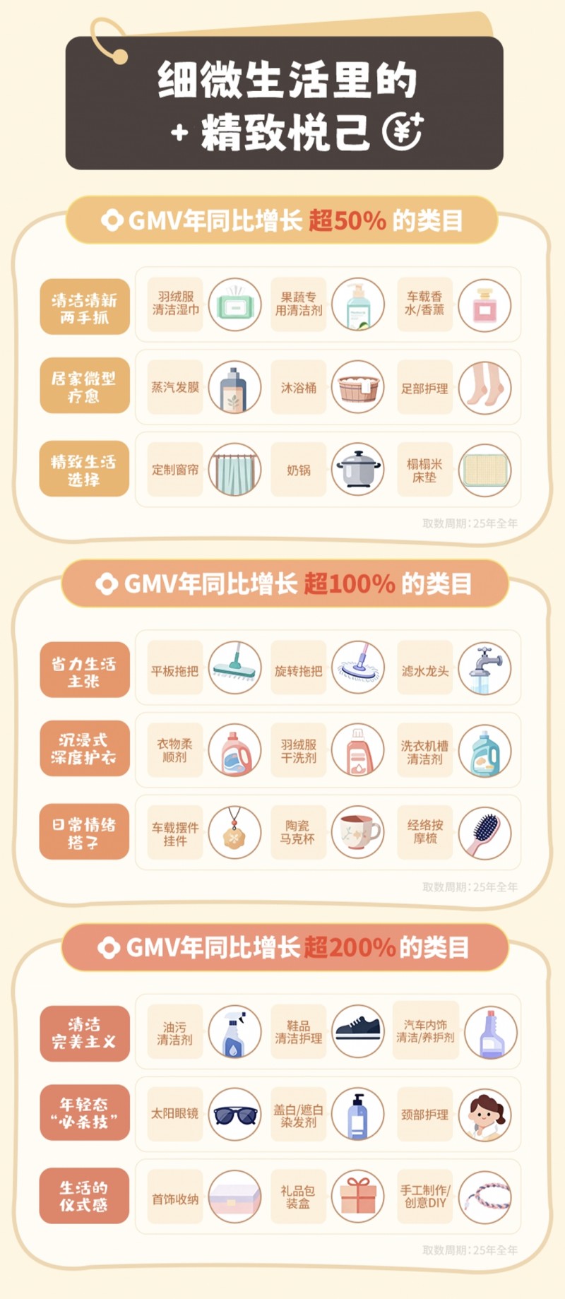 平台数据显示,2025年全年,GMV年同比增长超50%的类目包括羽绒服清洁湿巾、车载香水/香氛、蒸汽发膜、沐浴桶、定制窗帘、榻榻米床垫等,用户对空间的清洁清新、自我疗愈、家居定制的需求越发凸显。