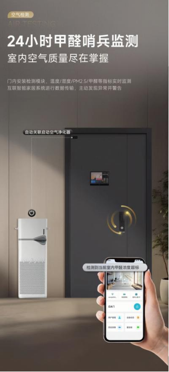 甲醛哨兵检测技术则打通安防与健康场景,实时监测甲醛、PM2.5、温湿度等居家环境指标,通过门体大屏与手机App同步数据,联动新风系统、空气净化器等设备,形成“监测—告警—净化”的健康闭环,让智能门成为家庭健康守护者。