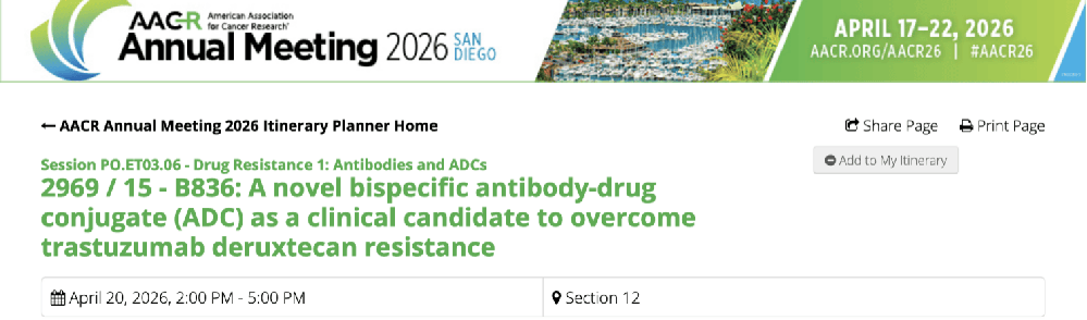 纳安生物自主研发的双特异性抗体偶联药物(ADC)B836相关研究成果,入选2026年美国癌症研究协会(AACR)年会“耐药:抗体和ADC(Drug Resistance: Antibodies and ADCs)”专题,并将在大会期间进行展示。
