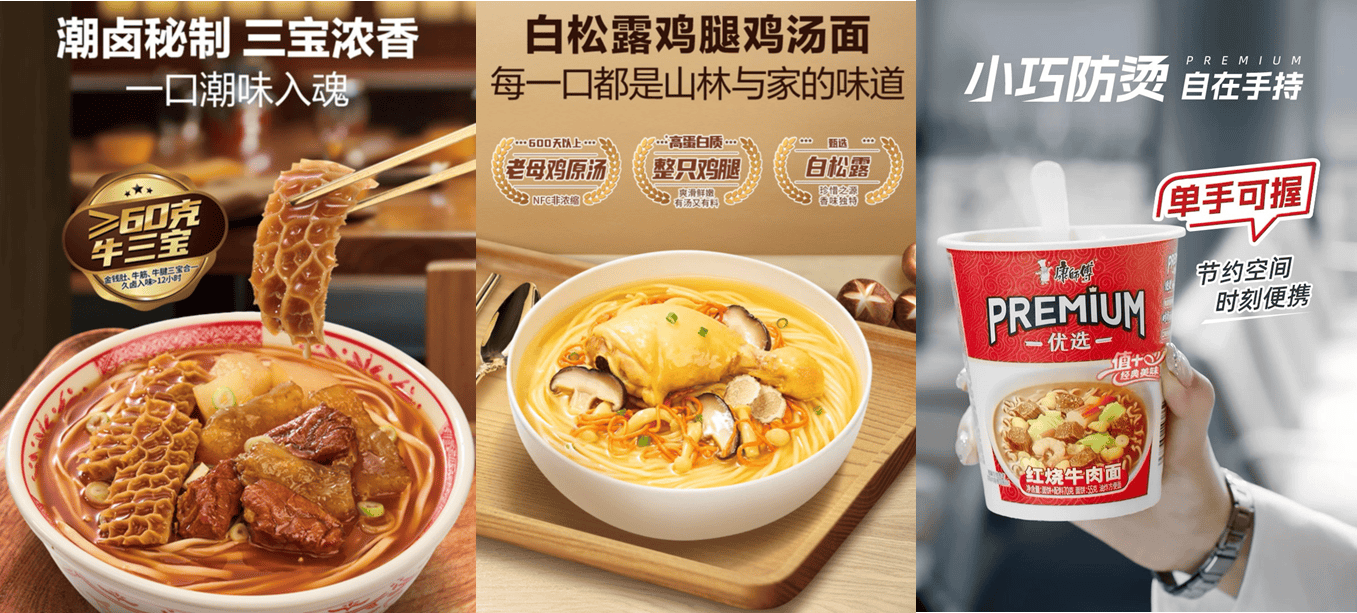 先看产品。从康师傅的产品矩阵中,可以清晰看到它在高端方便面上的持续进击:在红烧牛肉面、香辣牛肉面等经典“全民爆款”之外,过去一年,康师傅正有意识地针对差异化消费人群,推进品质升级与风味创新。